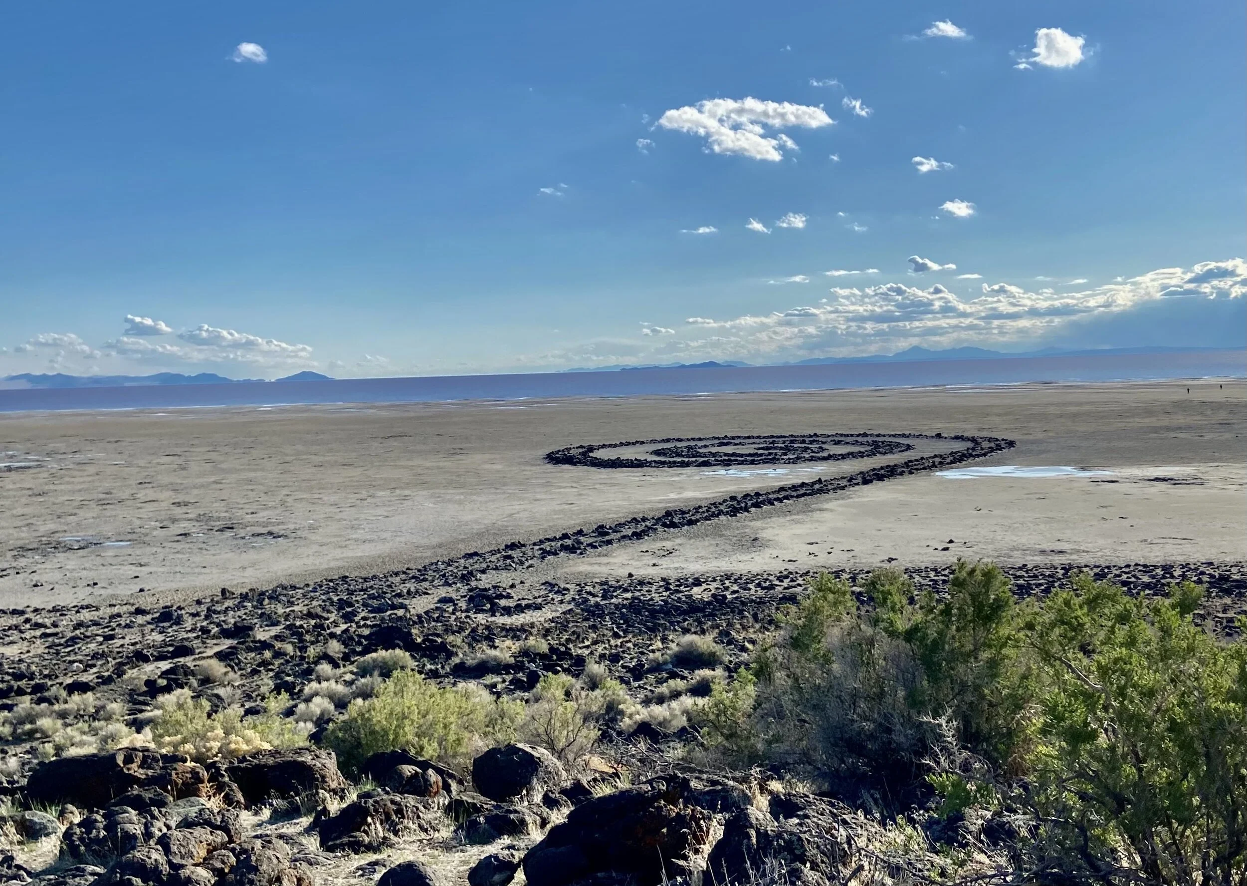 I'm standing on a salty shore of wet sand and lava rock, looking across a landscape that superficially presents as a beach, but reveals itself to be briny mudflat, with crystalline salt formations bedazzling the surface of a matte grey expanse. This is the northern extent of Great Salt Lake, where the water is red. Salty waves lap against a pepper shore. I ride my bike in lazy circles, cruising over the crust, and sinking into the quickness of the mud, dismounting and walking my bike, in slurpy steps, back to someplace stable, only to sink again. In the center of my circular impressions is a spiral, The Spiral Jetty. A monumental artwork of international fame, just laying there, in the mud, in the evening, plain as day.